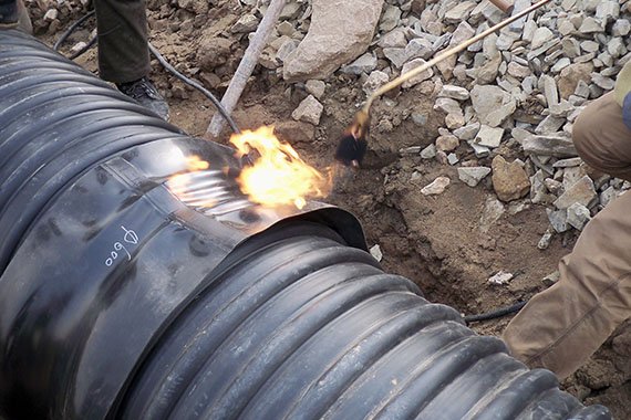 5. 安裝:趁熱將套管移至接頭處居中放置,取出隔離膜,從中間沿圓周方向均勻加熱,使其完全收縮后再分別向兩端延伸加熱。加熱時熱收縮套允許受熱溫度不得超過250℃。待全部收縮完后,再重新加熱表面有酒窩的地方,使其完全平整。整體加熱完畢后,應(yīng)再重新加熱一遍,以使熱熔膠充分溢出。熱縮過程中用壓輥將熱縮套碾壓幾遍,并重點(diǎn)碾壓熔合搭接處,排除氣泡。熱縮完畢后,進(jìn)行質(zhì)量檢查。